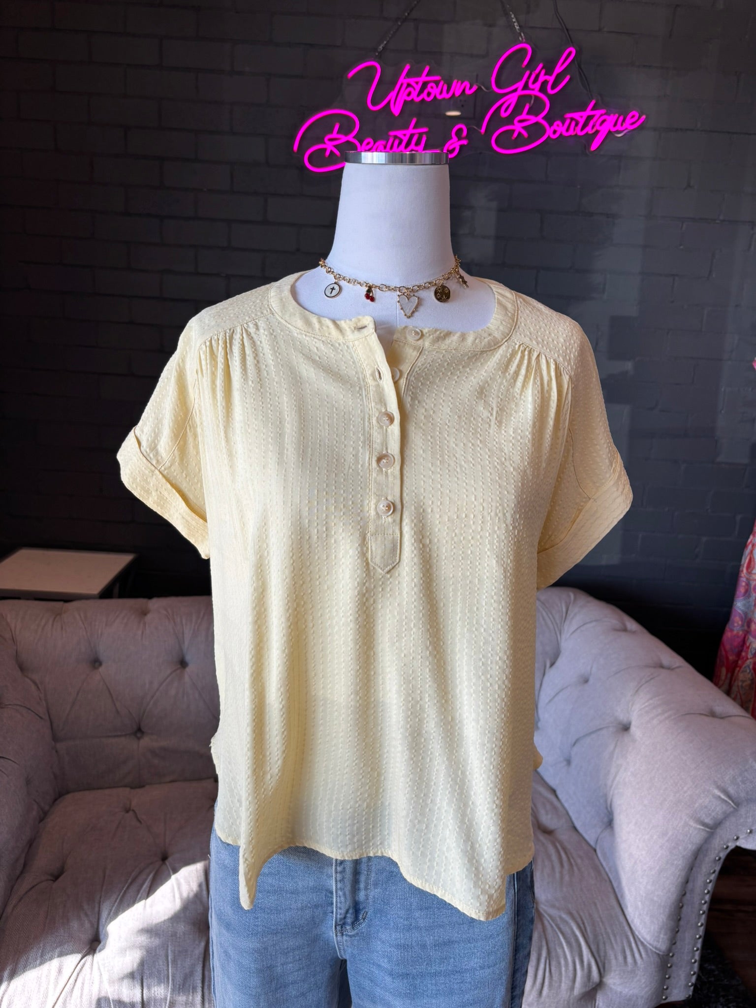 Elevate your everyday wardrobe with the Silvia Henley Top in a gorgeous butter yellow that's impossible to miss. This versatile woven piece features a flattering boat neckline, half-button henley detail, and charming ruched shoulder accents that add dimension and style. Crafted from a luxurious rayon and cotton blend, it's the perfect lightweight layer that transitions seamlessly from casual days to weekend outings.